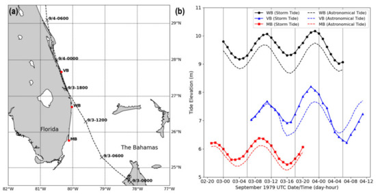 (a) Track of Hurricane David over eastern Florida and (b) recorded storm tide depth relative to the astronomical tide at MB, WB, and VB monitoring stations over their time intervals of interest (extracted from Howell et al. [51]).