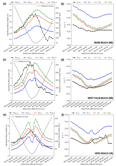 Figure 6e,f compare the measured significant height and peak frequency with their counterparts predicted via the parametric model for Vero Beach. The observational period ranged from 09/03 08:00 to 09/04 11:00 with the shortest distance between the storm center and monitoring site at approximately 14.1 km, being well within the radius to maximum winds as predicted by Equation (3). The parametric significant wave height was overpredicted across most of the monitored duration with the maximum of 4.93 m exceeding the peak observed of 3.51 m by 40%. The relatively low waves captured at Vero Beach may be a result of the hurricane passing over land on approach as shown in Figure 5a. The predicted decrease in arising from a reduction in local wind as the station was enveloped within the radius to maximum winds () was also not observed, possibly indicating the dominance of larger swells during this interval. In terms of peak frequency, was overestimated during the growth stage but underestimated over the initial decay period. The steep increase in during the decay stage (not observed for MB and WB) was suggested to stem from the inland trajectory of the storm coinciding with the severest conditions at VB [36], a feature unable to accounted for in the parametric model. Comparisons between the parametric spectral shape produced using Equation (29) and that witnessed at VB for times corresponding to the severest sea states are shown in Figure 7c with significant wave heights summarized in Table 1.
