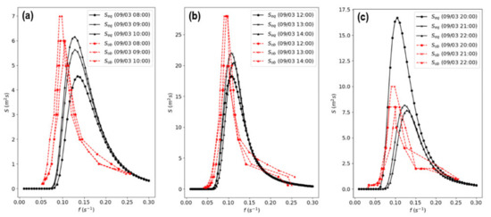 Figure 6a,b illustrate the comparison between the measured significant height () and peak frequency () with their counterparts predicted via the parametric model for Miami Beach. The observational period extended from 09/02 22:00 to 09/03 20:00 to which the shortest distance between the storm center and monitoring site was approximately 70.5 km. It is observed that the combined swell/wind-sea significant height predicted via the parametric model was largely successful in capturing the growth stage while significantly overestimating the decay phase as the storm continues northwards. The maximum predicted significant height of 3.01 m was also 14% greater than the 2.65 m observed at the station. The overestimation in during the decay stage may be attributed to model neglecting the presence of land in its treatment of swell and the estimation of equivalent fetch for wind waves. As the eye passes the MB site, northerly and westerly cyclonic winds prevail which primarily travels over land. Site conditions would therefore be governed by finite-depth wind waves with a reduced fetch than that determined from the model which assumes an unlimited expanse of water in all directions. The peak frequency was also consistently overestimated over the entire observation period. However, discrepancies between the measured and modeled becomes smaller as the distance between the eye and monitoring site decreases. Comparisons between the parametric spectral shape produced using Equation (29) and that witnessed at MB for times corresponding to the severest sea states are shown in Figure 7a with significant wave heights summarized in Table 1.