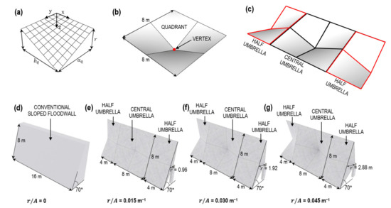 The performance of kinetic umbrellas as adaptable floodwalls against hurricane-induced coastal inundation was subsequently evaluated using the proposed shallow water spectral model implemented within a SPH computational framework. The geometry of four-sided kinetic umbrellas adopted in this work were based upon Wang et al. [7] with each side measuring 8 m (yielding a projected area of 64 m2). Each umbrella (Figure 8b) was constructed via the merger of four straight-edged hypar quadrants (Figure 8a) defined mathematically via based on the axis shown in Figure 8a, where is the warping or twist of the umbrella [52]. The length of each square quadrant was maintained at = = 4 m while four different rises of = 0, 0.96 m, 1.92 m, and 2.88 m were adopted to adjust the extent of geometrical warping. This correlates to rise-over-area ratios of = 0, 0.015 m−1, 0.030 m−1, and 0.045 m−1, respectively, with = 0 effectively reflecting a conventional flat floodwall. Since kinetic umbrellas are designed to operate as part of a continuous impermeable barrier, two additional half umbrellas with the same rise were placed adjacent to the central umbrella to enforce this boundary condition as depicted in Figure 8c. All umbrellas are tilted at a constant angle of inclination of 70° via a column supporting the vertex, yielding a total deployed height of 7.52 m. Full 3D models of the umbrellas exhibiting their respective ratios implemented with the SPH simulation are shown in Figure 8d–g.