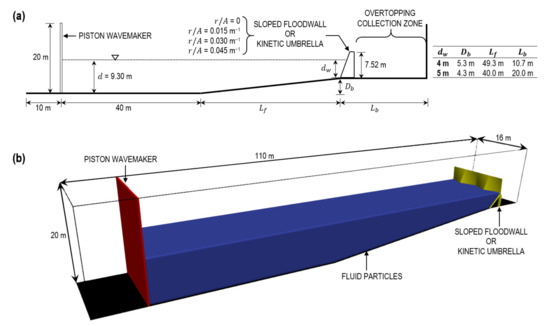 Figure 9a,b present a schematic and 3D view of the SPH computation domain with all relevant dimensions indicated, respectively. A still water elevation of 9.3 m was implemented to reflect the conditions at West Palm Beach during the most severe waves and constitutes an intermediate water depth condition. This location was selected since the largest waves were recorded here. Two inundation depths () at the floodwall of 4 m and 5 m were adopted by adjusting the length of the slope leading up to the barrier while maintaining a constant angle of 6.1° as shown in the table in Figure 9a. A piston wavemaker (composed of boundary particles) was positioned at the seaward end of the domain, which was used to generate waves consistent with the spectra at West Palm Beach. The floodwall/kinetic umbrellas (Figure 8d–g) were first modeled in SketchUp Pro 2020 [56] and exported into the computational domain in STL format. The imported geometry was discretized into a triangular lattice by the DualSPHysics preprocessor before being converted into boundary particles. An overtopping collection zone was defined between the rear face of each barrier and the shoreward end of the domain (Figure 9a). The volume of overtopped water may therefore be determined by the DualSPHysics solver by counting the number of particles entering the zone. Particles with an initial interparticle spacing () of 0.15 m were employed across all simulations. This gives rise to an approximate number of fluid particles of 3.25 × 106 and 3.1 × 106 for = 4 m and 5 m respectively. Each simulation spans 80 s of physical time () with a sampling frequency of 5 s−1 and was performed utilizing a NVIDIA GeForce RTX 2080Ti GPU with 4352 CUDA cores. This enables a sufficient number of waves to contact the structure such that overtopping can be captured, while still ensuring simulations can be completed within a reasonable timeframe (with each run taking approximately 19 h).
