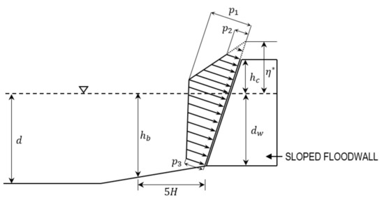 Parameters used for the computation of maximum wave pressures on sloped barriers per Tanimoto and Kimura [58].