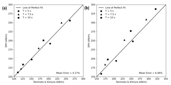 where . The total force per unit width is therefore the sum of the wave pressures depicted in Figure 10, and the corresponding hydrostatic component with a value of at the base. Comparisons between SPH and empirical forces were conducted for both inundation depths of = 4 m and 5 m across three different wave periods (5 s, 7.5 s, and 10 s) and wave heights (1 m, 2 m, and 3 m). Figure 11 and Table 2 illustrate the results of the comparison between SPH and Tanimoto and Kimura wave forces for both inundation depths. For the wave periods and heights considered, the mean absolute error across all cases are 4.17% and 6.46% pertaining to = 4 m and 5 m respectively.