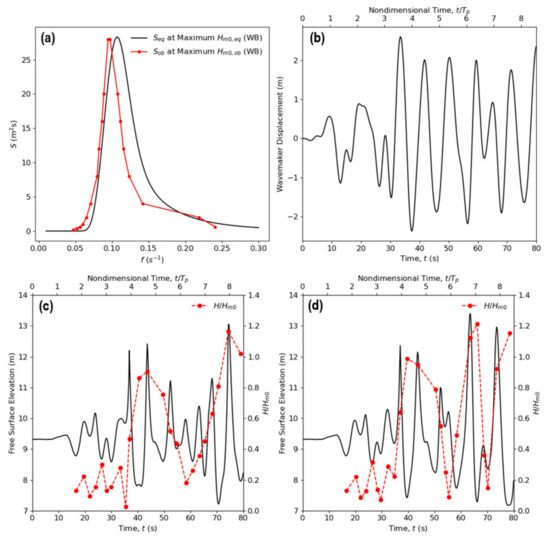 where , with being the period associated with the peak frequency . The wavemaker displacement per Equation (35) is shown via Figure 12b. The free surface elevation history and wave heights relative to at a location 40 m from the wavemaker’s initial position (and halfway between the longitudinal boundaries of the domain) for = 4 m and = 5 m is also shown via Figure 12c and d respectively. Given a total simulation time of = 80 s, the maximum nondimensional time normalized against the peak period is therefore = 8.56.