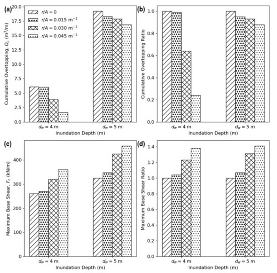 (a) Cumulative overtopping with (b) overtopping ratio relative to = 0 and (c) maximum horizontal base shear with (d) maximum base shear ratio relative to = 0 for various and .