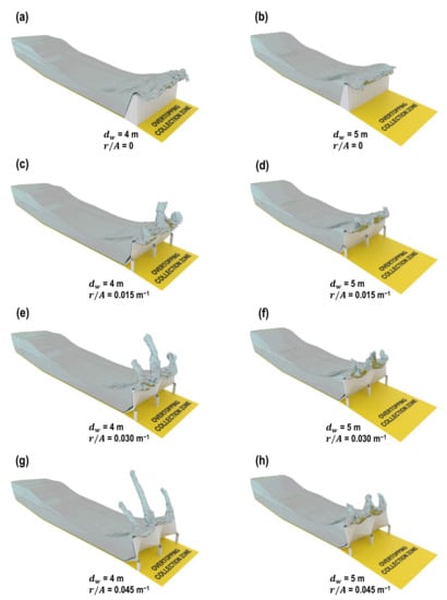 Observations of wave overtopping at approximately = 50 s pertaining to = 4 m and = 5 m for (a,b) = 0, (c,d) = 0.015 m−1, (e,f) = 0.030 m−1, and (g,h) = 0.045 m−1 for Kinetic Umbrellas subject to hurricane wave conditions.
