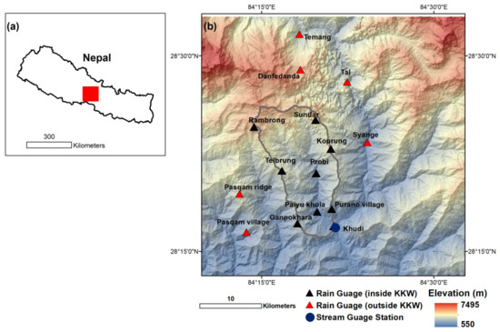 Location map of the study site (Khudi Khola Watershed, KKW) and hydroclimatological observatories: (a) Location of the study site in the southeast Asia, (b) topography derived from Shuttle RADAR Topography Mission (SRTM) digital elevation model (DEM) and locations of rain gauges and a streamflow gauge. The grey outline shows the KKW boundary.
