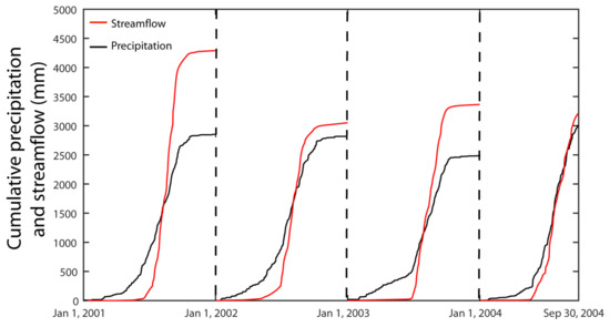 Cumulative annual precipitation (mm) and outlet streamflow (mm) during 2001–2004 period in the Khudi Khola Watershed (KKW). Note that precipitation is the arithmetic mean of precipitation estimates of all rain gauges in the KKW.