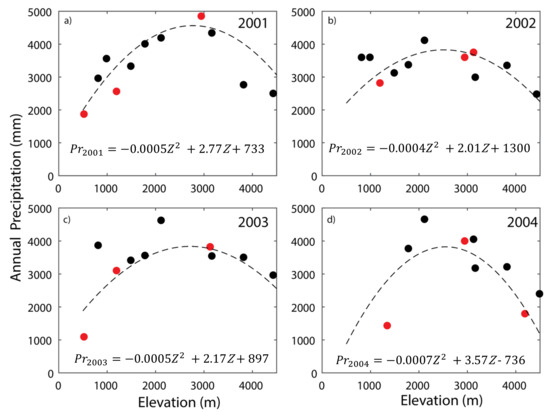 Function for interpolation of the precipitation based on the relationship between elevation and annual precipitation during each year of the 2001–2004 period in the study area. The red circles are rain gauges just outside the watershed and black circles are within the KKW. Note that equations are shown at the bottom of each subplot and derived using the data corresponding to black circles (within the KKW). Figure (a–d) represents the relationship between elevation and annual precipitation during 2001, 2002, 2003 and 2004 respectively.