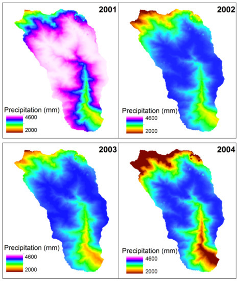 As a result of the above-listed reasons and given the high topographic complexity of the terrain, and the lack of small scale topographic and wind patterns to support more sophisticated analyses, we have chosen to use an interpolation method that is based on elevation only. Our approach to derive a precipitation model is based on statistical metrics (Table 1) and visual inspection (how effective the model is to capture the precipitation in the 2000–3000 m elevation band). We derived a separate quadratic polynomial equation for each water year using precipitation–elevation (Pr−Z) relationship of the stations inside KKW (Figure 3). Note that black circles in Figure 3 show the stations inside the watershed while rec circles represent stations outside or at the periphery of the watershed. The equations shown in Figure 3 are used to prepare annual precipitation maps (Figure 4) for 2001, 2002, 2003, and 2004 water years. These quadratic equations are effective in estimating the Pr of the 2000–3000 m elevation band as well as other elevation bands. Note that R2, NSE, and RMSE for the quadratic polynomial function are also reasonable considering the level of inherent topographic complexity in the KKW (Table 1). Putkonen [26] deployed 8 climate stations at the periphery and inside of the KKW and 6 climate stations at the neighboring watersheds of the KKW (Figure 1b). The data record of these gauges spans from 2000 to 2004. However, 4 of these climate stations are very far away from the KKW and the data are not available for some climate stations due to malfunction of equipment in some years. It is not uncommon to have one or two station’s equipment to malfunction and incomplete dataset amid such a large-scale field operation like Putkonen [26]. As a result, we utilize 11, 11, 10, and 9 stations in Figure 3 for 2001, 2002, 2003, and 2004, respectively.