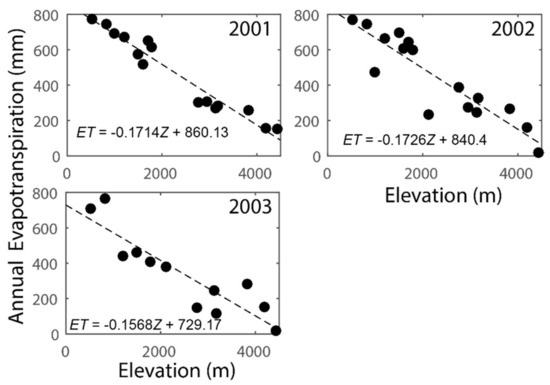 In these equations, streamflows are derived from field-based observation and ET is simulated at a daily scale using Equation (1) and integrated over each year. Using ET–Z relationship, Figure 6 is constructed and subsequently, we derived basin-scale ET from Figure 6. Note that ET for 2004 is calculated using data from only two stations distributed across elevation. Since ET is less than 10% of the annual water balance, we believe such limited data availability will have a minor influence on the scientific findings of our study.