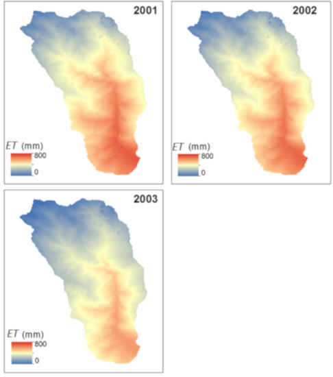 Figure 5 shows the plots between annual simulated ET and station elevations (Z) in the KKW during 2001, 2002, and 2003 water year. Unfortunately, adequate temperature and relative humidity data are not available for some climate stations during 2004 water year; thus, ET–Z is not possible to derive. Figure 5 shows a robust ET–Z relationship for water years with R2 around 0.9 (Table 1). We have utilized the strong ET–Z relationship of Figure 5 to produce annual ET maps (Figure 6) for 2001, 2002, and 2003 water years using ASTER DEM as the source for elevation data (Z).