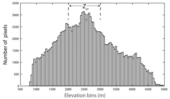 The Pr sharply increases with an elevation between outlet elevation (787 m) and 2000 m altitude. The rapid rise of Pr with Z in this elevation band contributes 29% of the KKW area. The Pr in this elevation band also accounts for 26%, 29%, 27%, and 24% for 2001, 2002, 2003, and 2004 water years, respectively. The elevation over Zcr is 31% of the study area and contributes 29%, 29%, 32%, and 35% of Pr for 2001, 2002, 2003, and 2004 water years, respectively. Our findings on the Pr−Z relationships are not comparable with Pr−Z relationships from other mountain ranges such as the Alps. Frei and Schar [33] reported a weak and insignificant Pr−Z relationship in the Alps. Several studies [34,35] attributed such weak height dependence to other physiographical factors (slope, topographic exposure, broad-scale topographic environment). Note that the findings from the Alps are based on observations from a dense local network while rain gauges in the HMA are sparse.