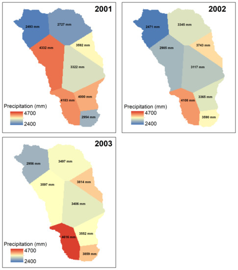 Generally, the polygons are created by the perpendicular bisectors of the lines connecting neighboring stations. The precipitation amount is measured in the center of the polygon, not estimated by its area. However, in case of missing rainfall data at any station, the polygon must be changed. Thiessen Pr estimates are generated with the same data used for the Pr–Z model in Figure 3. The number of stations used for 2001, 2002, and 2003 are 12, 10, and 10, respectively. All the stations are inside or at the periphery of the KKW except two stations in adjacent watersheds (Figure S2).