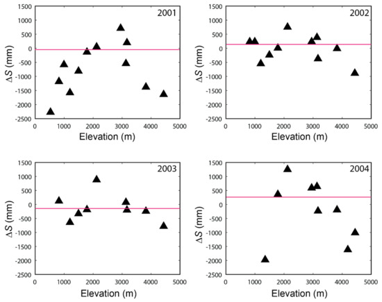 Since most of the hydrologic studies in HMA [22,24] utilize only rain gauges from lower altitude (due to inaccessibility and thick forest cover at high altitude), in Figure 10, we examine the optimum elevation up to which the rain gauges should be installed. This provides an interesting perspective in a way that it is useful to install rain gauge up to certain elevation to improve ΔS and the installation beyond this critical elevation will not improve the ΔS. Figure 10 shows the dynamics of ΔS with the number of rain gauges from the lowest altitude. As the elevation increases, we consider the mean of multiple rain gauges and at the highest altitude, the mean of all rain gauges is considered to calculate water balance. The ΔS changes clearly show that the ΔS approaches zero as the number of rain gauges increases with elevation during 2001, 2003, and 2004 water years. However, beyond ~2100 m altitude, the ΔS no longer improves and fluctuates very little during 2001, 2003, and 2004 water years, suggesting the importance of deploying rain gauges at the 528–2100 m elevation band. Unfortunately, since there is no rain gauge between 2100 and 3000 m altitude, we cannot conclusively recommend the upper limit of this elevation band. We believe more rain gauge installations at the 2100–3000 m elevation band in future studies will improve our knowledge and subsequently close ΔS.