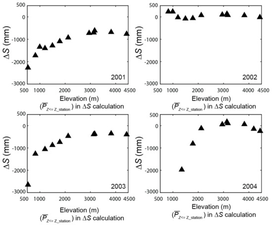 Figure 9 shows the influences on ΔS if we consider precipitation data from the individual rain gauge. Note that streamflow and ET are taken from Table 2 while calculating ΔS for Figure 9 during 2001, 2002, 2003, and 2004 water years. The solid red line shows the ΔS using Z-based Pr maps from Figure 4. The low elevation (Z < 2000 m) rain gauges are not able to close the ΔS during 2001 and 2004, while the failure to close ΔS is prominent using high elevation (Z > 3000 m) rain gauges for all water years. We believe, during 2002 and 2003, precipitation at low elevation rain gauges are higher due to localized convective systems resulting in improved ΔS. The rain gauges located at 2000-3000 m elevation band adequately close ΔS with few exceptions. However, our dataset has a limited number of rain gauges in this band while there are some around 2000 m and 3000 m elevation. Clearly, Figure 9 shows the effectiveness of rain gauges around 2000 m and 3000 m elevation in closing the ΔS for all water years. We believe these zones around 2000 m and 3000 m elevation band receive representative precipitation for the KKW. Thus, populating these zones with rain gauges will be helpful to close ΔS for hydrologic studies in similar watersheds in HMA.