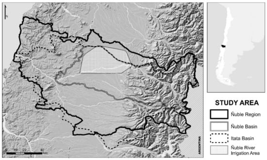 Study area. Ñuble River irrigation system (ÑRIS) (white area), Ñuble River basin (double black solid line), Itata River basin (dotted line) and Ñuble Region (black solid line).