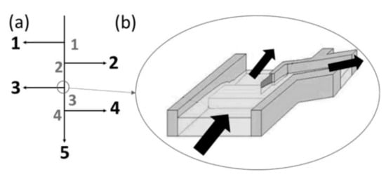 Proportional flow dividers. (a) Flow divider location in a canal; the blue numbers represent the nodes and the black numbers the users. (b) Flow divider diagram.