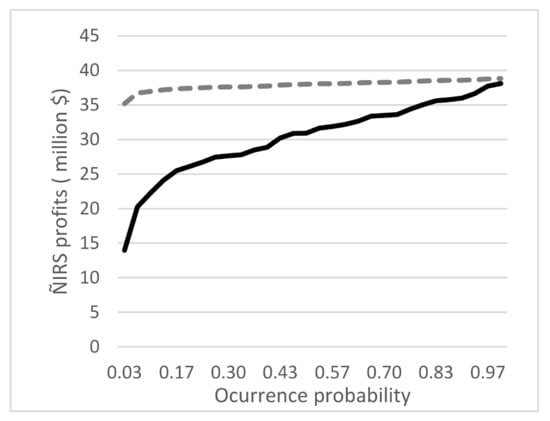 Economic profits of the ÑRIS. Hydrologic occurrence probability for market profits under current (solid line) and perfect (dotted line) market conditions.