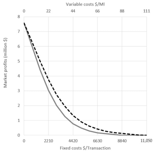 Transaction costs and market profits. Relationship between fixed (solid line) and variable (dotted line) transaction costs and market benefits.