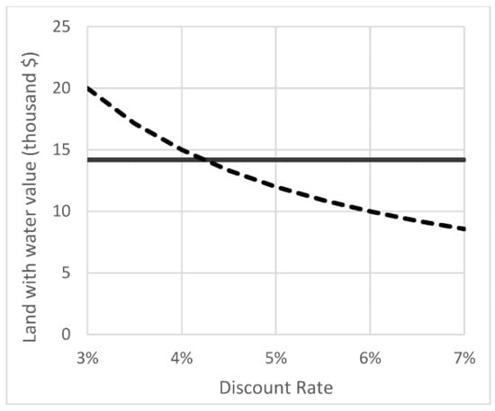 Validation and discount rate. Relationship between the market (solid line) and model (dotted line) predicted value of land with water.