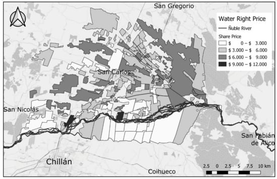 Actual economic yields observed in current water markets in Chile are far from their potential yields []. Given the lower availability of flowing water due to climate variability [,], there is a need for more competitive water markets and a more efficient use of this limited resource. The findings regarding the limitations of the Ñuble River water market can be extended to other water markets in Chile and other countries with similar challenges in terms of rigid infrastructure and climate variability. In addition, the proposed model allows for an economic assessment of off-farm irrigation investments that leads to better management of water, a scarce resource.