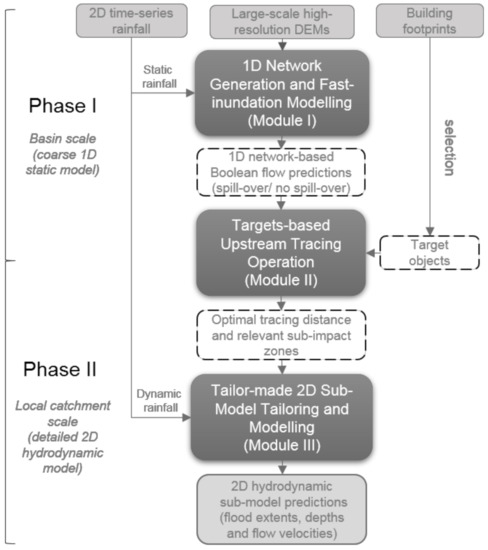 The sub-model approach consists of three modules (Modules I–III, as illustrated in Figure 1 and Appendix A). Module I extracts the 1D network from the DEMs and enables a fast-inundation simulation considering the spatial-varying rainfall. Modules II performs the upstream tracing operation and identifies the sub-impact zones relevant to specified targets. Module III extracts the critical computational cells based on identified sub-impact zones and configures the reduced domain and the optimised boundary condition for the full 2D hydrodynamic modelling. The general procedure is programmed and wrapped up within the ArcGIS Desktop ver. 10.6’s Python programming interface (ArcPy).