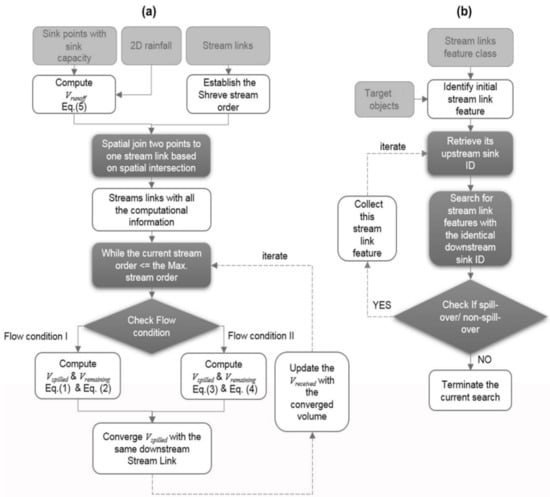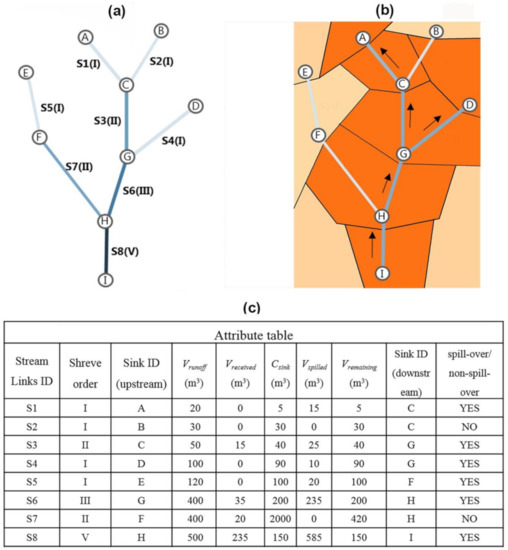 The suggested algorithm uses stream links as computational objects. Therefore, all information related to sink features (points), i.e., Csink, Vrunoff, Vreceived, Vspilled and Vremaining, is joined onto their intersected stream links (edges). This allows for the subsequent fast-inundation calculation to be exclusively based on one stream link feature class’ attribute table (see Figure 3c). The Shreve stream order [70] is used to determine the correct computational order of stream links and the convergence order of excess flows. By governing the conservation of mass balance within each stream link, flood volumes are computed according to two flow conditions: