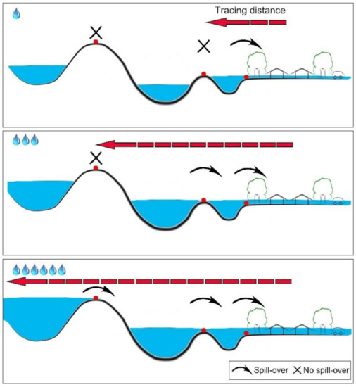 Targets-based upstream tracing procedure along stream links at various uniform rainfall scenarios, where the optimal tracing distance (red arrow) is determined from the continuity of overland flow based on spill-over and non-spill-over properties. Note: The number of raindrops represents the rainfall’s magnitude and No spill-over refers to the termination criterion to stop further upstream tracing. In case of a distributed rainfall, various optimal tracing distance in relation to target objects should be determined.