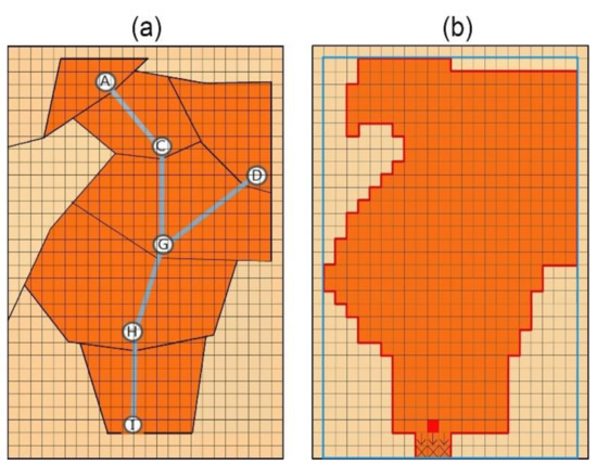 (a) The intersection between sub-impact zones and the high-resolution DEM’s grids. (b) The computational domain determination for MIKE FLOOD’s 2D simulation, where dark orange grid-cells represents critical computational cells configuring the reduced computational domain, the blue frame represents the reduced rectangular modelling grid extent and the red frame represents the reduced computational domain and the optimised boundary conditions. The red grid-cell represents the location of terminal pour points, and the grid-cells marked ↓ configure the 2D weir having the spilling elevation level. Furthermore, the grid-cells marked × configure retention volumes based on decreased elevations.
