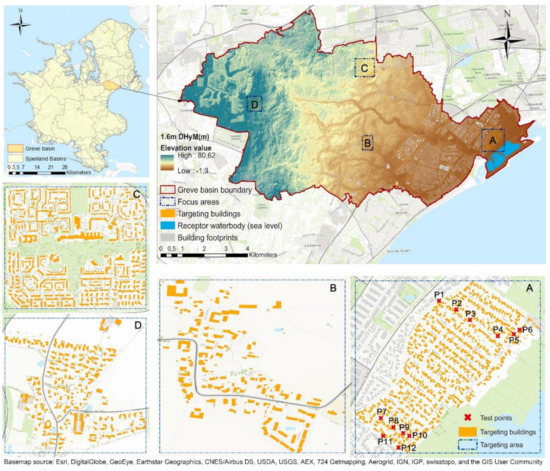 Case study area: Basin divisions for Zealand and location of the Greve basin (upper left); the hydro-conditioned elevation model (1.6 m resolution) covering the Greve basin (upper right). Map A, B, C and D show four selected focus areas and their target objects (buildings) that were hit by the extreme rainfall event on 2 July 2011. Areas marked with a red × represent locations where water depths and velocity hydrographs are extracted (L-shaped in the northeast, F-shaped in the south).