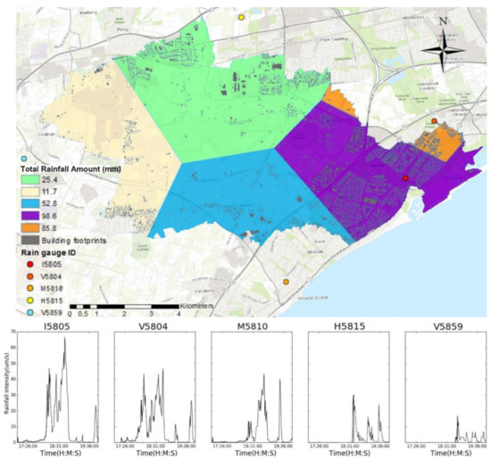 An extreme precipitation event on 2 July 2011 was selected. Due to the large extent of the Greve basin, we used data from five available rain gauges to cover the basin-wise rainfall heterogeneities (see Figure 7). The Thiessen polygon approach was applied to distribute precipitation data from these rain gauges onto their nearest neighbourhoods (Figure 7), simulating the pattern of the progressively decreasing rainfall from the eastern coastline towards the western inland. According to the time-series for I5805 (shown as hyetographs in Figure 7), the overall simulation time of 172 min was used for MIKE FLOOD, where the simulation continued for 97 min after the main peak, allowing for the sufficient time for flood peaks to flow through the landscape.