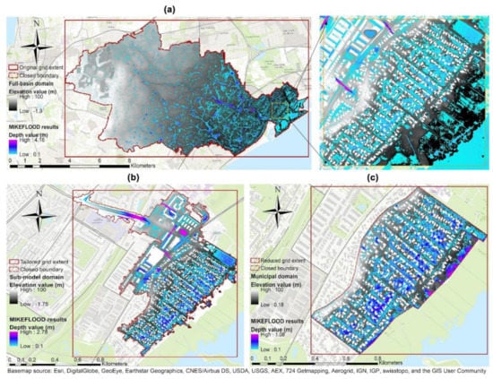 MIKE FLOOD’s 2D prediction results produced from the three different domains are presented in Figure 8a–c, where a 10 cm flood depth was adopted as the threshold defining critical flood depths. To demonstrate the discrepancies of maximum depth flood extents, binary analyses (dry/wet) from the status of the flooded cells were conducted (Figure 9a,b). The predicted inundation extents had a good agreement in most areas, while overestimations occurred along the downstream edge as expected from using the closed boundary. In contrast to the municipality domain approach, the sub-model approach returned fewer overestimations that tended to occur near terminal pour points only.