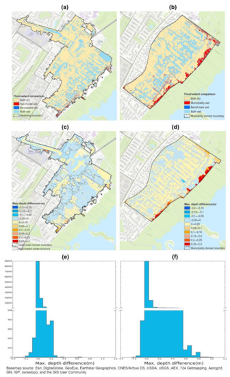 Benchmarking discrepancies in Max. depth flood extents: (a) Sub-model approach’s categorised map, (b) Municipality domain approach’s categorised maps. Benchmarking discrepancies in Max. flood depths: (c) Sub-model approach’s depth difference map, (d) Municipality domain approach’s depth difference map, (e) Sub-model approach’s histogram of Max. depth difference, (f) Municipality domain approach’s histogram of Max. depth difference.