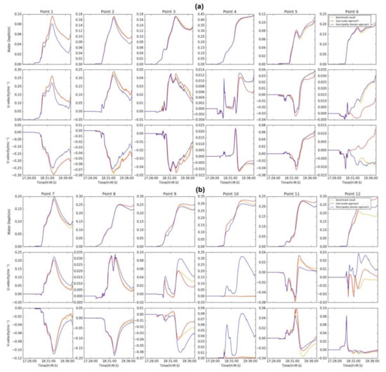 Figure 10a shows hydrographs for points 1–6 in terms of depths, u- and v-velocities for the L-shaped flow pattern. For points 1–5, good agreements with the benchmark regarding depths hydrograph’s rising and falling limbs were obtained when using the sub-model approach. For points 1 and 2, in contrast to the municipality domain approach, average higher depth values accompanied by higher flow velocities for the sub-model approach were observed. Most likely, this happens because the extended regions restored the flooding propagation channel allowing more water outside the targeted region to enter, which is consistent with findings by [78]. Additionally, whereas over-predictions occurred at the downstream ponding area of point 6, this error of <~0.05 m was considered insignificant. Apparently, u- and v-velocity hydrographs derived from the sub-model approach mostly replicated the predictions in the benchmark at points 1–5. Yet, an entirely different flow direction was identified at point 6 compared to the benchmark, whereas insignificant differences of <0.02 ms−1 were found. As the consequence of the closed boundary, its hydraulic behaviour alters the actual runoff patterns, i.e., spilling to downstream, into a permanent ponding condition, and further inverse the flow direction due to the corresponding backwater effect.
