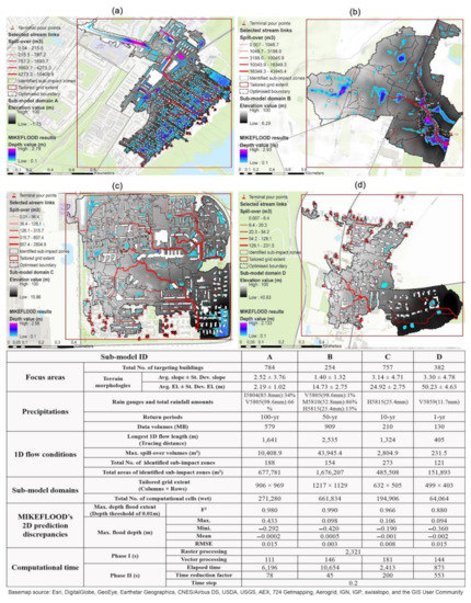 Four sub-models’ 1D flow conditions, identified computational domains and their correspondent MIKE FLOOD predictions based on various types of terrain morphologies and rainfall return periods in 1–100 years: (a) Sub-model A, (b) Sub-model B, (c) Sub-model C and (d) Sub-model D. The optimised boundary conditions suggested by the sub-model approach are used for four sub-model simulations, where 2D outlets are established at the terminal pour points position that allows for water spilling at the pour point level. The detailed inputs, outputs, prediction validation and computational time information for each sub-model are provided in the table.