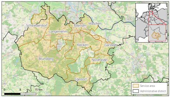 The service area of the Wasserbeschaffungsverband WBV Harburg is located in northern Germany, south of the Elbe river and in the metropolitan area of the city of Hamburg. Its coverage encompasses around 960 km2 (Figure 1), which is about 77% of the entire administrative district of Harburg. The service area is in turn divided into nine service zones that are provided with distinct water meters [17]. The main water sources are several underground sources (22 wells) that provide groundwater through pumping. The whole network is comprised of 1669 km of pipes supplying drinking water to 12 municipalities [18] and thereby satisfying the water demand of approximately 184,000 people [19]. Since the district is located in the metropolitan area of Hamburg, it is tightly connected to the city, economically. This is supported by the fact that 64,617 out of 82,998 employees resident in the district (78%) are outbound commuters, while another 27,431 people come in from neighboring districts on a daily basis. This results in a net negative commuters accounting balance of −37,186 people, which means that, on a regular weekday, the district’s total population is reduced by about −15% [20]. In the service area itself, about 37% of the employees work in the trade, transport and hospitality sectors, while another 21% work in the manufacturing industry. Only 2% are employed in the agricultural sector [20]. Overall, the district’s municipalities are characterized by extensive residential areas with about 81% of all residential buildings being single-family houses [20].