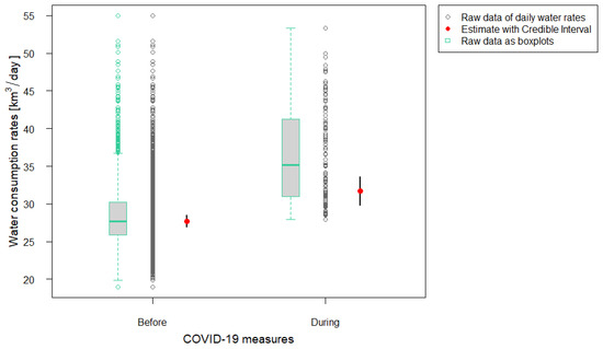 Daily water consumption volumes before and during strict Corona measures. Fitted values (red circle), predicted from the linear mixed model, with 95% credible intervals are given assuming average values for all other independent variables. NBefore = 1470 days (2006–2019 each 03/16–06/28); NDuring = 105 days (16 March–28 June 2020).