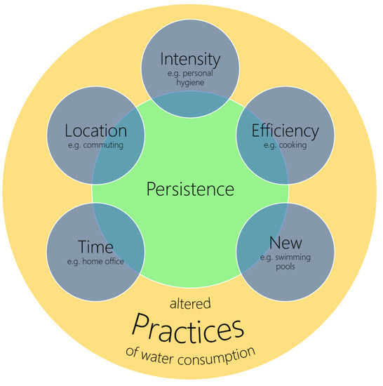 Our analysis reveals that the COVID-19 restrictions of public life resulted in an increase of domestic water demand in the study area. This effect is likely to occur in similar regions of Germany and beyond, as the socioeconomic and sociocultural structures of Harburg (cf. Chapter 2.1) are typical for many metropolitan regions close to larger, economically important cities (e.g., Berlin, Frankfurt, Munich, Stuttgart, etc.) [32]. The interesting question at this point is, why do these effects occur? In the following, we intend to provide a brief discussion of potential hypotheses and how these may be empirically tested. It is not our aim to propose a comprehensive framework of altered water consumption practices, but rather to suggest speculative hypotheses that need further empirical consideration. In this regard, we build upon and look beyond the findings of a recent study conducted by Alda-Vidal et al. [16] in England and Wales, who looked into household water consumption during COVID-19. Figure 5 gives an overview of five dimensions for which we think that altered practices may have caused the observed water consumption increases. A sixth dimension covers the cross-cutting question of the short- and long-lasting character of the observed changes.