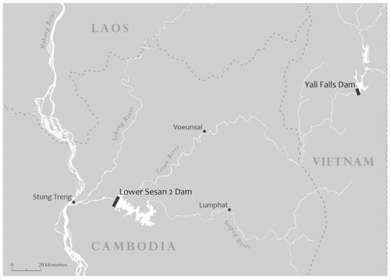 Since 2000, Cambodia has experienced strong economic growth, which has subsequently resulted in increased electricity demand. In the 2000s, the vast majority of Cambodians did not have access to electricity, with 60% of urban dwellers and only 10% of rural inhabitants having access [32], and even as of 2018, Cambodia’s electrification rate was still only 60%. Moreover, half of the country’s rural population still lack ready access to electricity [33]. To meet this demand, the government has partially turned to hydropower. While a number of dams have been built outside of the Mekong River Basin in southern Cambodia [34], we focus on two projects within the Mekong River Basin. The first is the Yali Falls Dam, situated in the Central Highlands of Vietnam, and the second being the Lower Sesan 2 Dam, which operates as a run-of-the-river dam [35] and is situated in northeastern Cambodia. Both dams are constructed in the Sesan River Basin and have caused considerable social and environmental impacts on upstream and downstream ecologies and peoples. On 17 December 2018, Cambodia’s Prime Minister Hun Sen inaugurated the Lower Sesan 2 (LS2) hydropower plant (Figure 1) [36]. LS2 has been met with considerable controversy and resistance from local peoples and their supporters since its inception [26,37,38]. The tendency to oppose the dam stems from the ecological and social impacts borne by people living in northeastern Cambodia downstream from the Yali Falls Dam (completed in 2001) and other dams on the Vietnamese side of the border. The transboundary and cumulative character of these projects has been an added challenge for those downstream in Cambodia [15,16,39].
