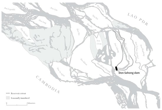 Clearly visible from Cambodia’s Preah Rumkel Commune in Thalaboriwatt District, Stung Treng Province, Laos’ 260 MW Don Sahong Hydropower Project operates as a run-of-the-river dam and is located in the Khone Falls area, a series of channels, waterfalls, and small islands in the mainstream Mekong River in Khong District, Champassak Province, southern Laos (Figure 2). The project commenced commercial operation in November 2019, with agreements to sell power to neighboring Cambodia and Thailand [52]. This section examines the geographic extent of impacts on fisheries, food security, and changing livelihoods for those in the Khone Falls area. Many years before its construction began in 2016, concerns regarding the impacts of the dam on fish and fisheries were expressed by locals and researchers [53,54]. The Khone Falls area is important for migratory fish as they seasonally pass through the Khone Falls area and move upriver to feed and spawn [3,48,54,55,56,57,58,59,60,61]. Many locals and scientists believe that a large proportion of the fish that migrate from Cambodia to Laos previously passed through the Sahong Channel, making it one of the most important migratory corridors in the entire Lower Mekong Basin [3]. However, it was this very channel where the Don Sahong Dam was constructed.