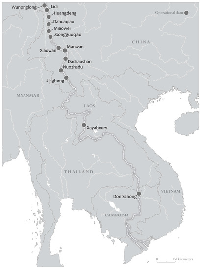 With a length of 4909 km beginning in China and flowing through Myanmar, Thailand, Laos, Cambodia, and Vietnam before emptying into the South China Sea [1], the Mekong River and its tributaries constitute one of the most important freshwater aquatic systems in the world, with globally significant aquatic biodiversity, aquatic biological production, and connection to human livelihood. More than 65 million people live in the Mekong River Basin, 40% of whom reside within 15 km of the mainstream Mekong itself. Many of these people depend on the river for food security, livelihood, and trade [2]. The river is unique in that annual variations between low and high water volumes are greater in the Mekong than for any other large river in the world, resulting in a variety of environmental conditions and habitats critical for a high diversity of aquatic life [3]. However, the Mekong River Basin has experienced a number of critical changes over the last few decades, particularly due to the development of a large number of hydropower dams. Many of these projects have caused serious social and environmental impacts, ones with implications far beyond the locations where the projects were constructed. Thus, the particular geographies of the social and environmental impacts of hydropower dams in the Mekong River Basin are crucial to consider.