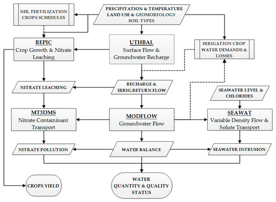 The scope of this study is to present the development of a modeling system for the evaluation of the surface water balance on a sub-basin scale, the crop water demands, the nitrates leached from the unsaturated zone, the groundwater quantity, and nitrate pollution and salinization in an aquifer system, on a grid-scale. The developed integrated modeling system consists of coupled simulation models of the natural processes of the hydrologic cycle, and the contamination events and their impacts. The components of the system are the models of surface hydrology (UTHBAL) [1], groundwater hydrology (MODFLOW) [40], crop growth/nitrate leaching (REPIC), which is an innovative R-ArcGIS user interface with the EPIC model [41], contaminant transport/ nitrate pollution (MT3DMS) [42], and seawater intrusion/aquifer salinization (SEAWAT) [43].