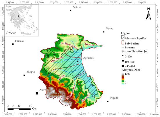 Almyros aquifer system, elevation and streams of sub-basins, and locations of weather stations.