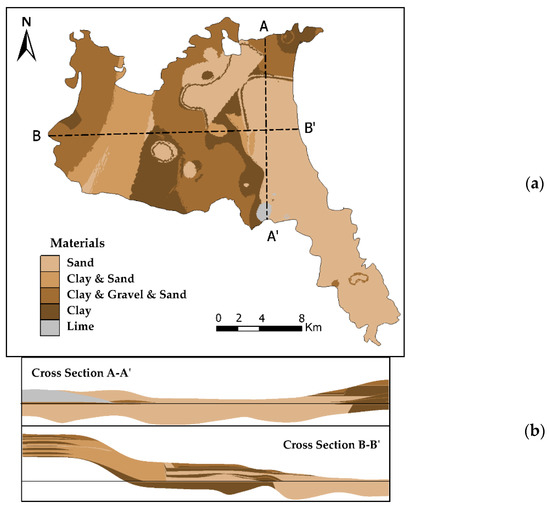 Borehole data of 55 wells in the area of Almyros drilled between 1968 and 1990, from the Greek Ministry of Agriculture, were used to produce the stratigraphy of the aquifer. The main geological materials of the Almyros aquifer are classified into five categories, namely clay (Neogene), clay-gravel-sand (Neogene), sand (Quaternary), clay-sand (Neogene), and limestone and form the aquifer of the study basin. The top view and the two most representative cross-sections of the geological materials of the aquifer are presented in Figure 3.