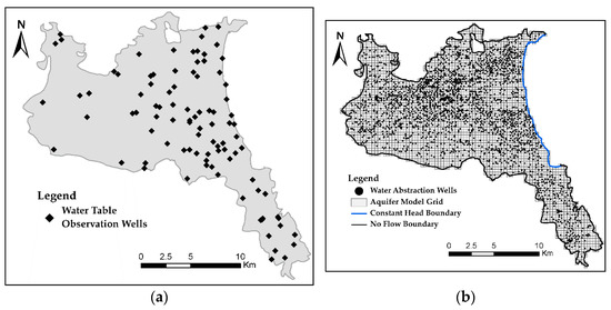 (a) Locations of water table observation wells and (b) locations of groundwater abstraction wells.