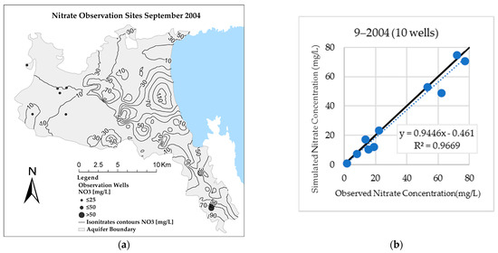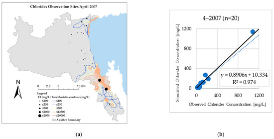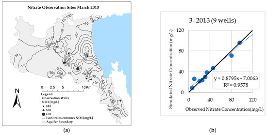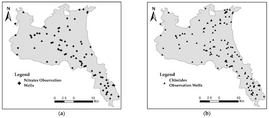 The distribution of wells of observed nitrates concentrations and chloride concentrations are presented in Figure 5a,b, respectively.