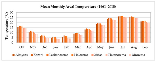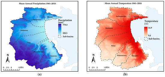 For the estimation of areal precipitation, the gradient method modified with the Thiessen polygon method was used. The gradient for the annual precipitation to 100 m of elevation change in the Almyros basin is 15.9 mm (R2 = 0.70), while the gradient for the annual temperature is −0.43 °C per 100 m increase in elevation for the whole basin (R2 = 0.71). The spatial distribution of mean annual precipitation and temperature is presented in Figure 6.