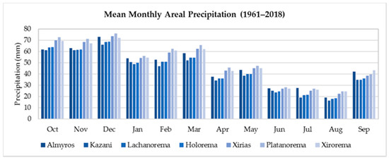 Monthly precipitation and temperature collected in six (6) meteorological stations distributed in and around the basin were used in this study. The locations of the stations are depicted in Figure 2. The range of the elevation of the stations is among 3 m and 850 m. Daily and monthly precipitation data, daily and monthly minimum, maximum and mean temperature data were available for the station of N.Aghialos, the only station located in the basin, from 1961 to 2018. The meteorological data are collected by various governmental organizations and agencies. They have been pre-processed and validated.