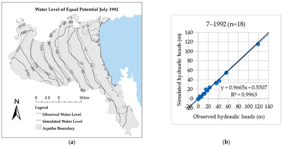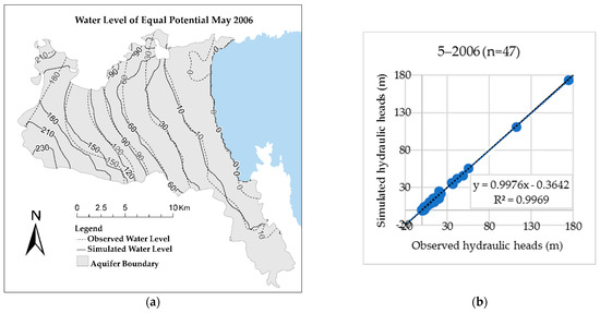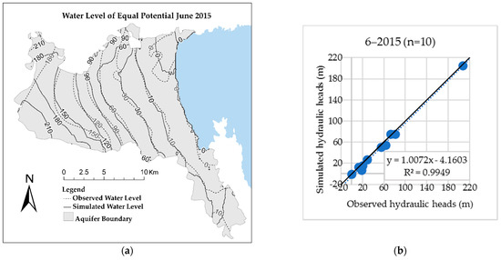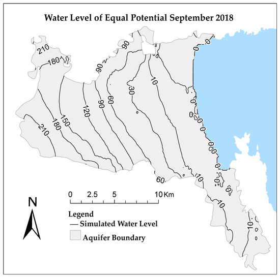 In a variably structured model grid, the aquifer is divided in layer(s), which can be confined, unconfined, or a mixture of confined and unconfined representing a homogeneous-heterogeneous isotropic, or anisotropic aquifer system. Furthermore, the model layer(s) can be inclined, or not, and have different cell sizes and layer thickness. MODFLOW is capable of simulating water flow originating from sources out of the aquifer model, and from physical causes of groundwater movement; such are the water abstraction flow rates of wells, constant hydraulic head bodies, and groundwater recharge. These are represented mathematically with boundary conditions and incorporate the solution of Equation (1). The main water flow boundary conditions are the hydraulic head along an aquifer’s margins (Dirichlet Condition), the hydraulic head gradient across an aquifer’s boundaries (Neumann Condition), and the combination of the two (Cauchy Condition). The hydraulic head variations are, then, calculated for each time-step of the simulated stress period [40].